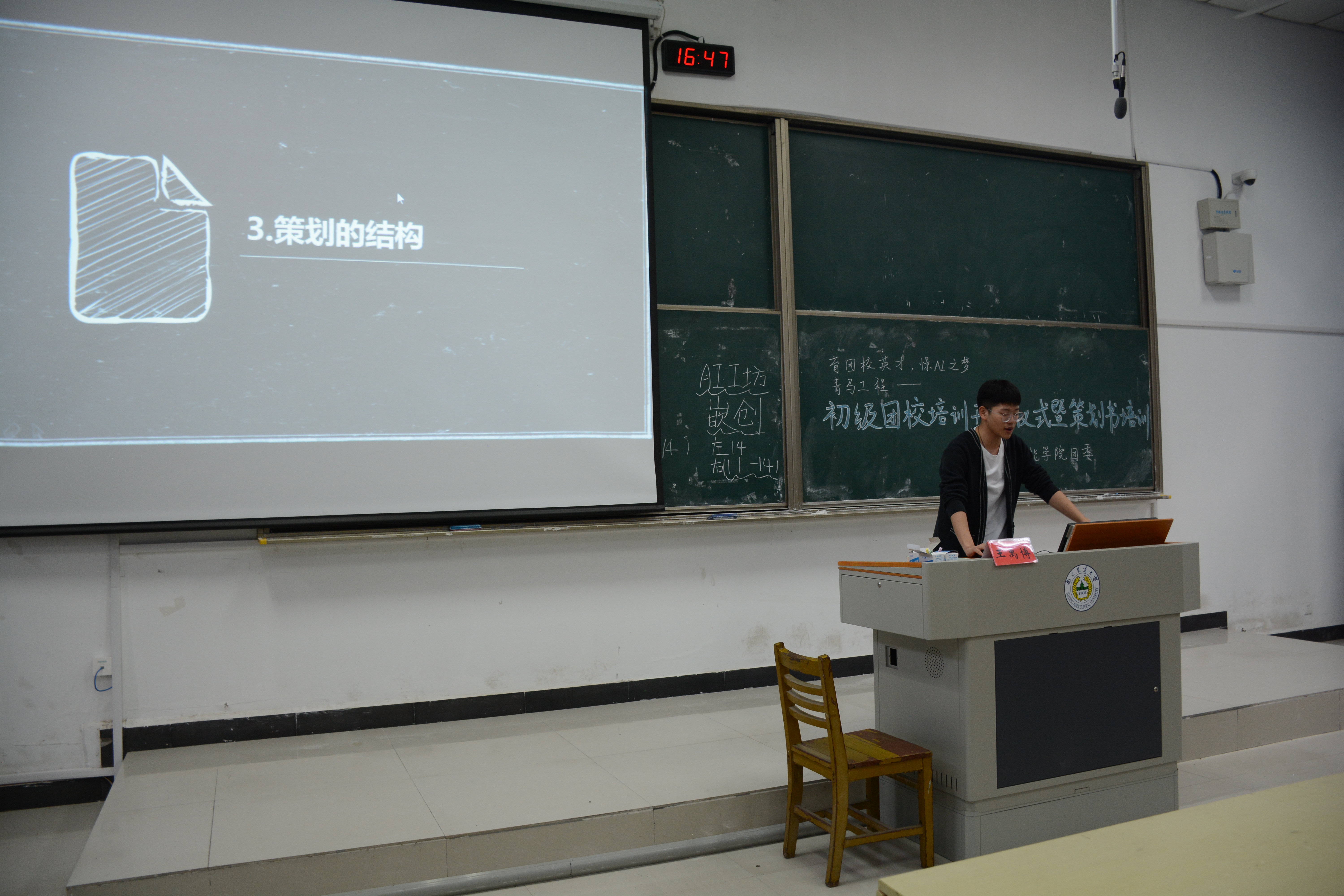 培训开始,王禹博为同学们进行策划书培训。他先从大型活动、必办活动和创意性活动三个方面介绍了策划的定义,指出了不同类型的策划有不同的注意点和需求。随后王禹博提出了策划的重要性,指出策划是办活动的第一步,更是活动的指南针。接着他着重地讲解了策划的结构,详细点明了封面、活动目的、活动主题等各个部分的要求和需要注意的细节。最后,对于如何写好策划的问题,王禹博指明:只有多尝试着写,才能有所提高。