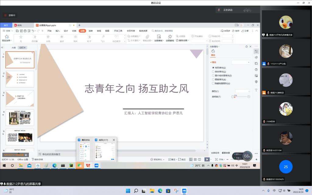 团委监察部线上召开高级团校培训之“志青年之向,扬互助之风”志愿经验分享讲座。此次活动面向全校同学展开,校团委青年发展部副部长万洋波、暑假志愿活动优秀学生叶恩以及院青协红会干事尹思凡出席本次讲座。