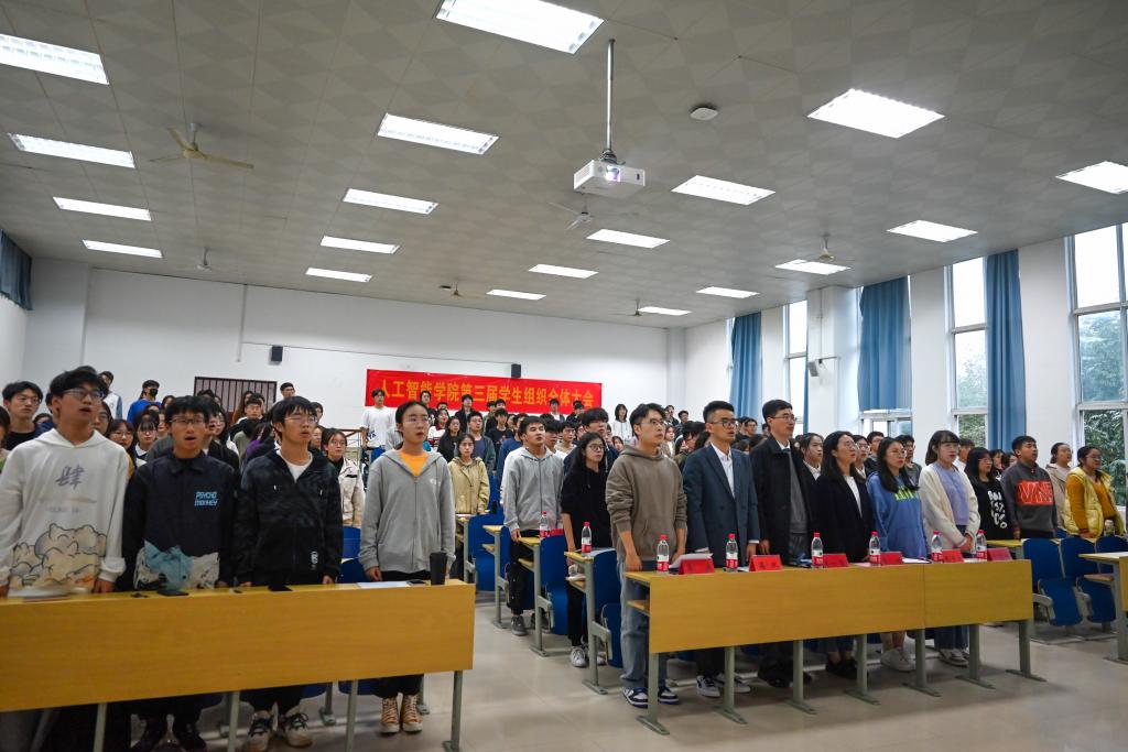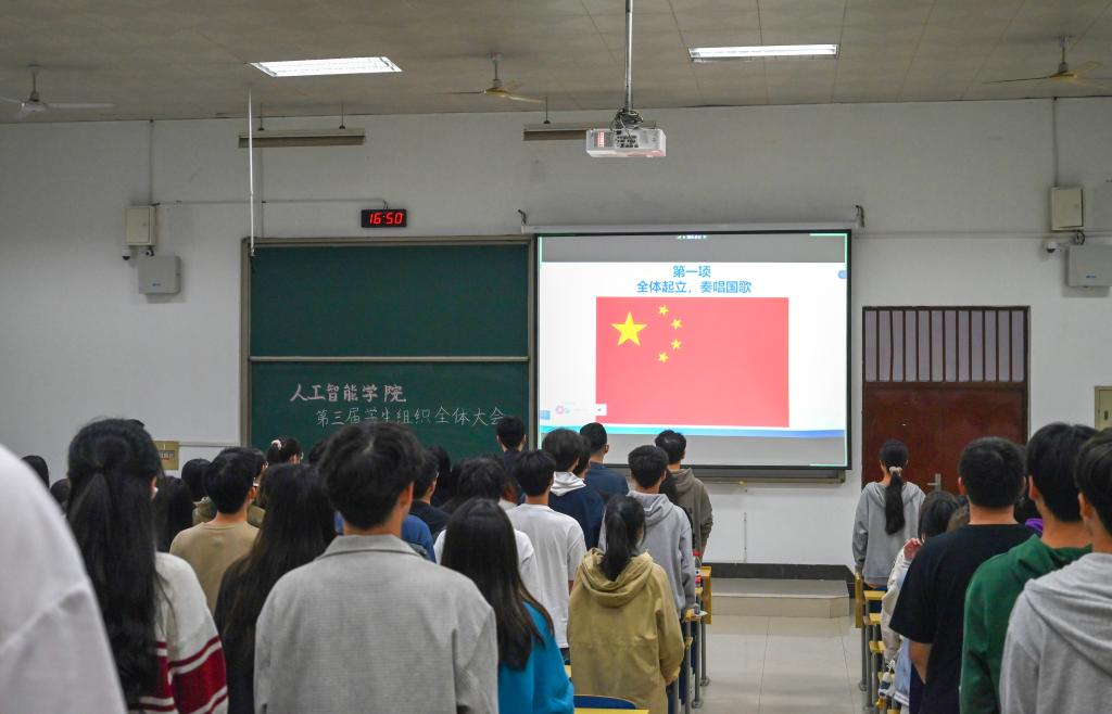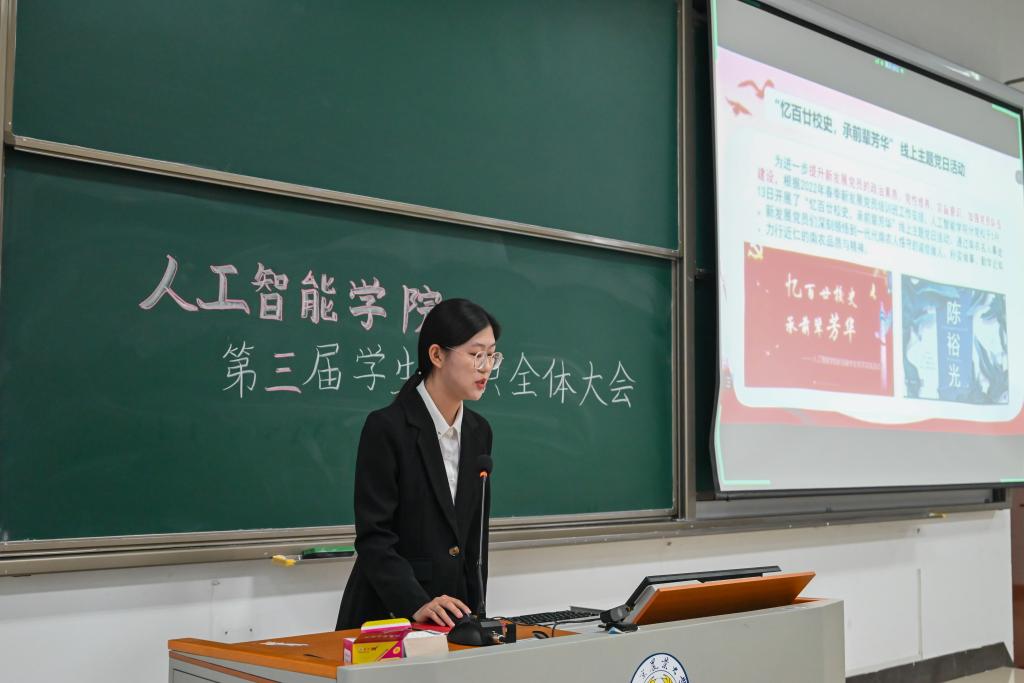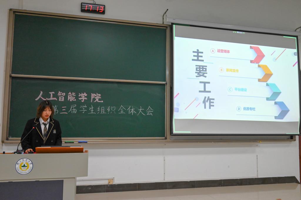 会议第二项,分党校秘书长南靖妍、学生团委副书记刘雅彬、学生会执行主席刘涛、全媒体中心主任梅秋怡、AI工坊主席王楚涵依次上台,分别介绍日本无码