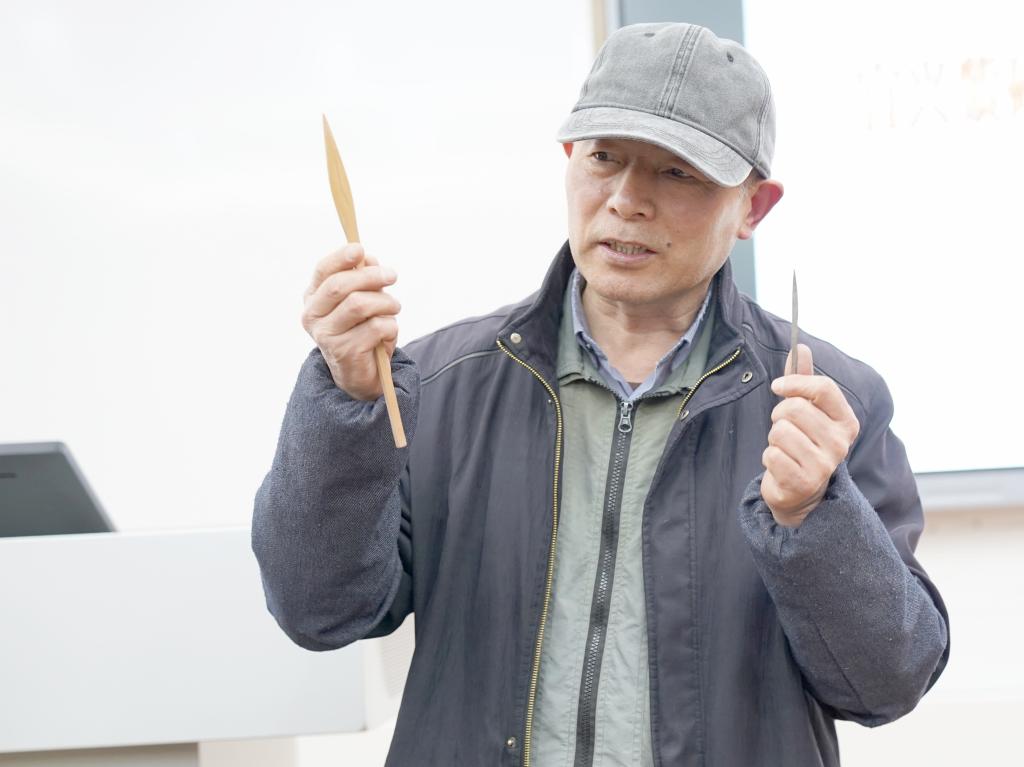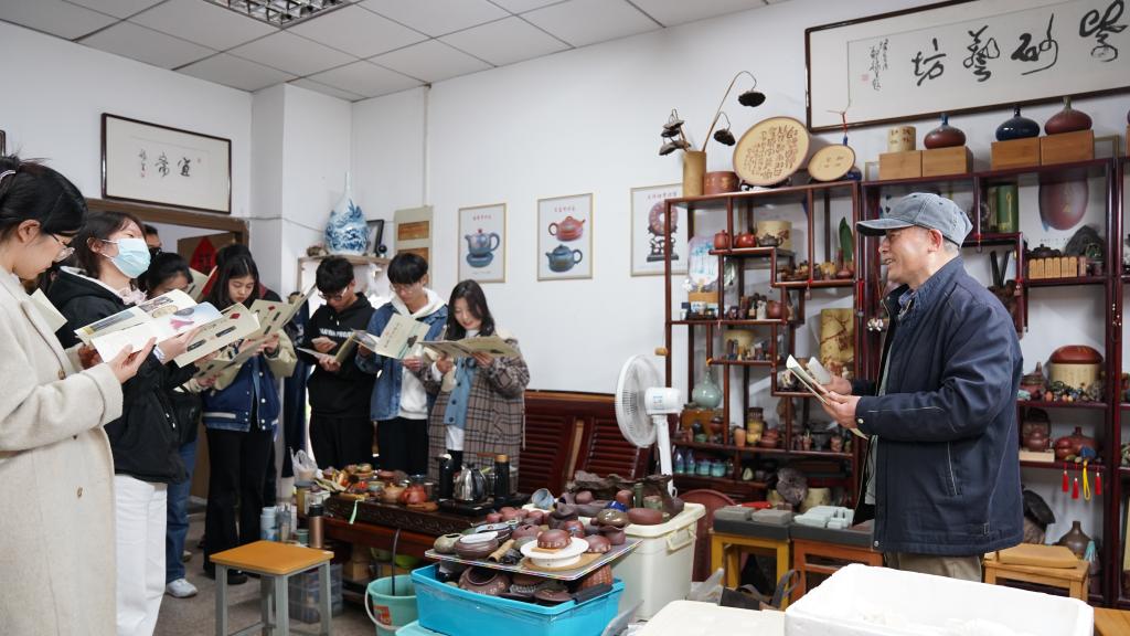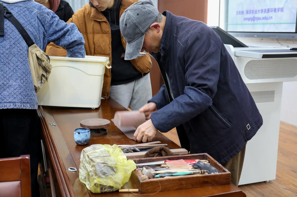 为了让同学们进一步了解宜兴紫砂的概况,宗良纲分别从泥料、造型、工艺、落款、功能和作品名称六个大方面和“一看二摸三试水”三个步骤进行一一讲解与示范,并向大家介绍陶艺成型方法,耐心地向同学们展示这些方法的核心要点和巧妙之处。宗教授指出陶艺是科学与艺术的结合,高校对大学生的培养正全面实施素质教育,故而他秉持着“文理融通”的教学理念,为智能院的同学赋能文化自信,力求输送更多高质量的复合型人才。