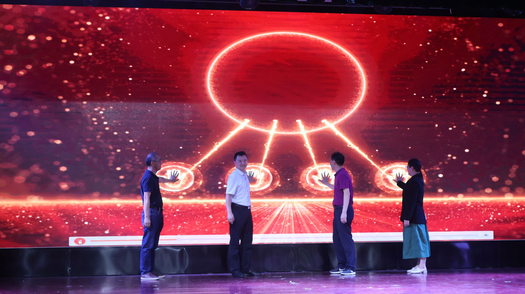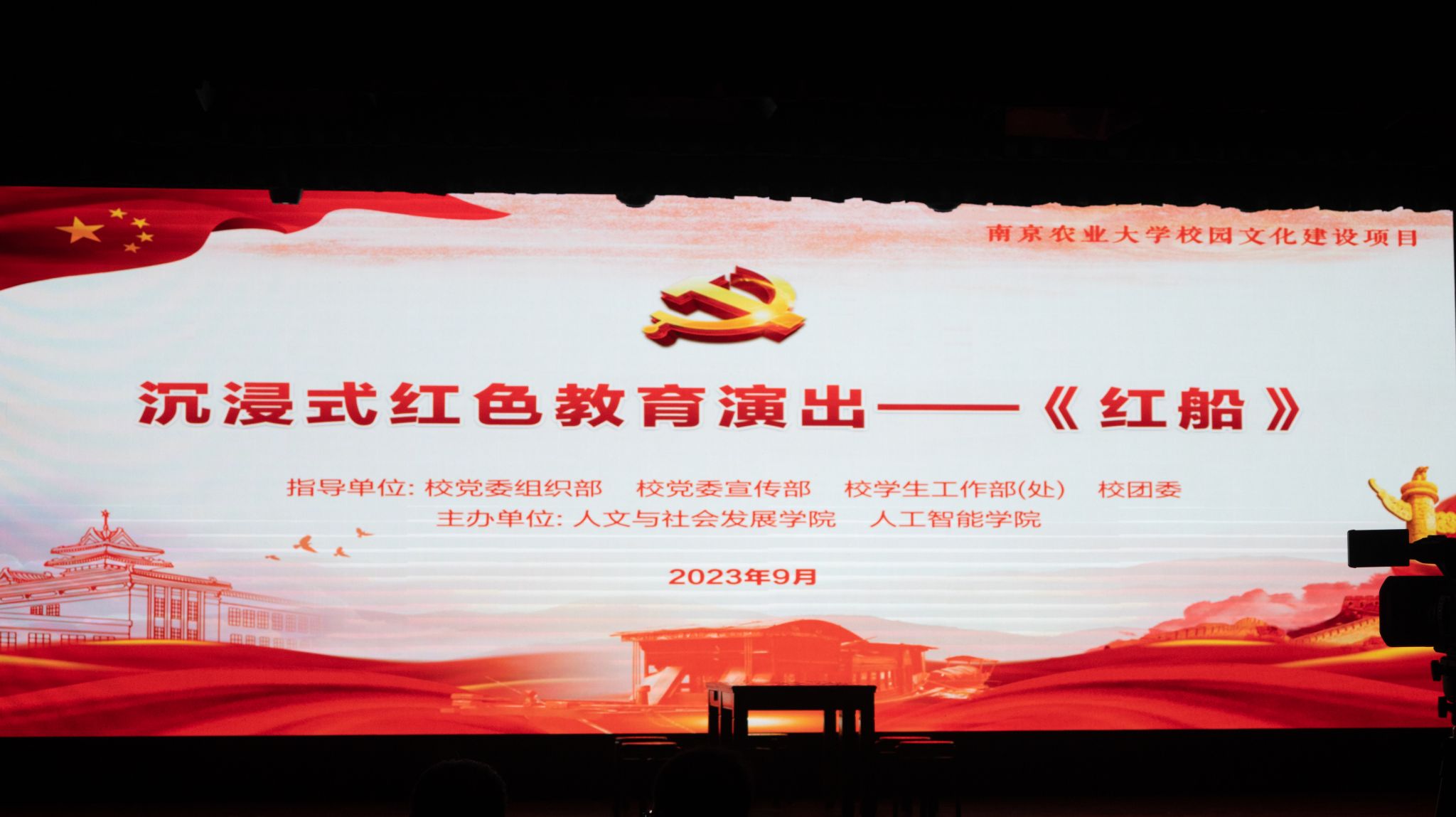 师生的原创话剧、沉浸式红色教育演出——《红船》,该话剧由人文与社会发展学院殷昊罡教授指导、艺术系学生自编、自导、自演。以“一叶红船承载的红色基因”为线索,重现毛泽东、董必武、李达、李汉俊等13位一大代表创立中国共产党的光荣历程,再现建党的恢宏时刻,谱写了一部“弘扬‘红船精神’、传承初心使命”的时代赞歌,演出跌宕起伏、引人入胜,引发了现场师生阵阵掌声。