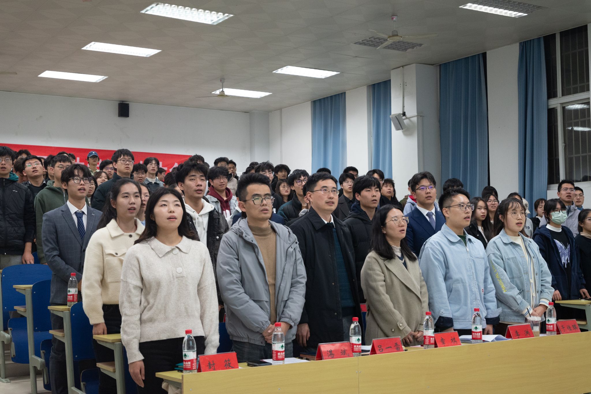 大会伊始,全体师生起立奏唱国歌。