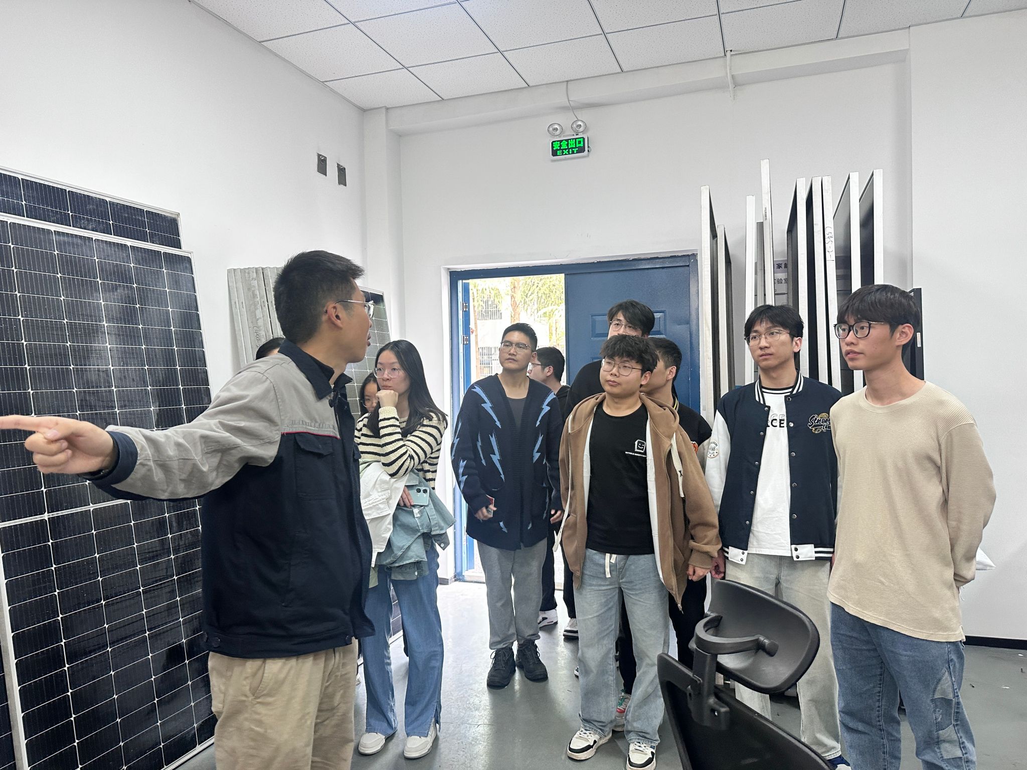 零碳园区负责人王宇热情地接待了参观团一行,向同学们介绍了公司的开创史和发展规划,并带领同学们参观了光伏车棚、地面光伏实证区等地点,便于同学们了解企业的运作模式,感受文化氛围。随后,项目经理朱昊天带领同学们参观了光伏检测实验室,详细讲解了外观检测台、静态压力板、绝缘耐压测力仪等诸多仪器的功能和使用方法。在参观过程中,朱昊天还重点介绍了光伏系统的具体功能,并向同学们展示了系统收集到的最新数据。参观结束后,同学们表现出浓厚的兴趣,结合自身专业,与朱经理就数据来源、应用技术等方面进行讨论,在讨论中积极提出自身看法。行程最后,同学们纷纷表示这次活动拓宽了自己的视野,收获颇丰。人工智能专业吴刘柯表示,通过本次企业交流活动,了解到理论运用于实际的前沿科技;老师们的分享为其打开了学术与产业结合的新视野。
