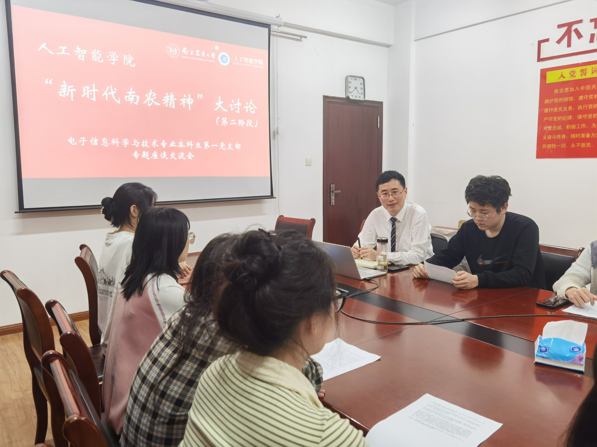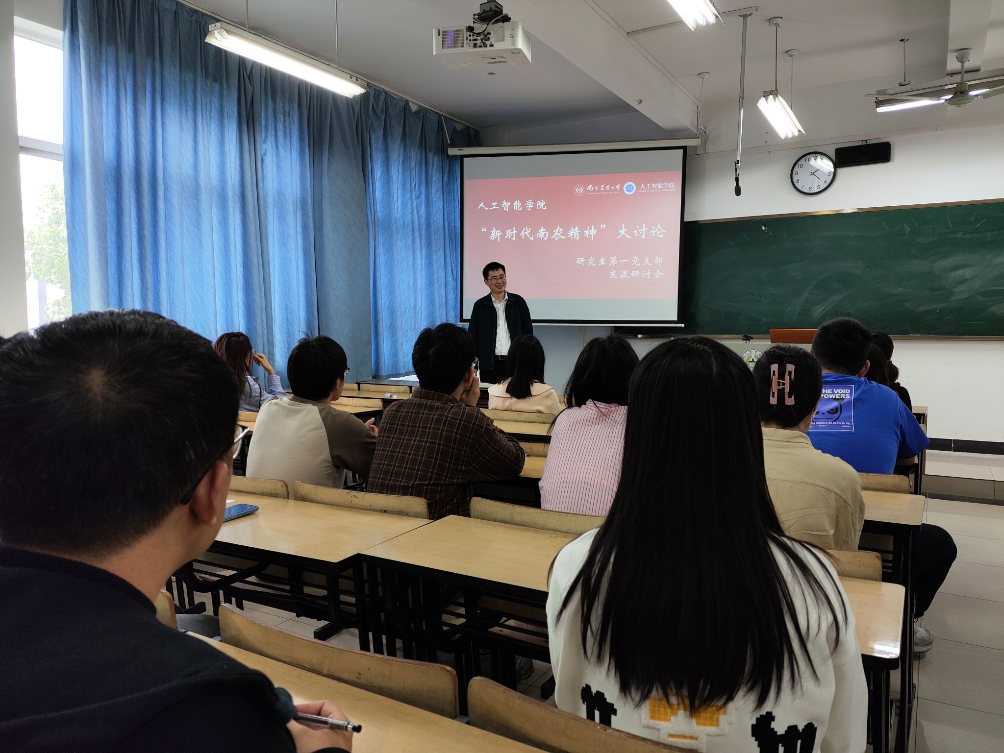 4月25日下午,研究生第一党支部、研究生第二党支部在汇贤楼A306教室联合举办“新时代南农精神大讨论”第二阶段会议。学院党委副书记吕一雷,研究生全体党员和学生代表参加研讨。围绕“新时代南农精神与人工智能创新实践”的核心议题,参会党员和学生代表积极发言,分享了各自在学习、科研中的心得体会,探讨了如何将南农精神融入人工智能科研与社会服务中,以科技赋能农业现代化,促进乡村振兴。会议最后,吕一雷书记做讨论总结。他表示,希望支委们认真梳理会议成果,将其转化为具体行动计划,推动南农精神在人工智能领域的创新实践中落地生根、开花结果。