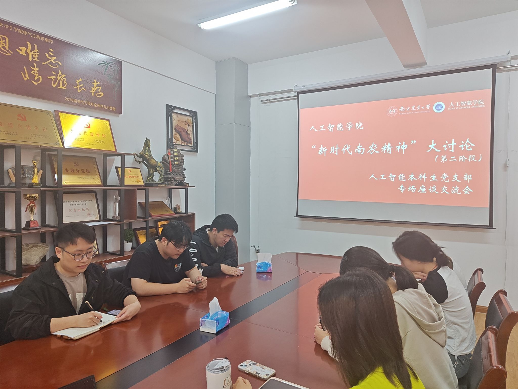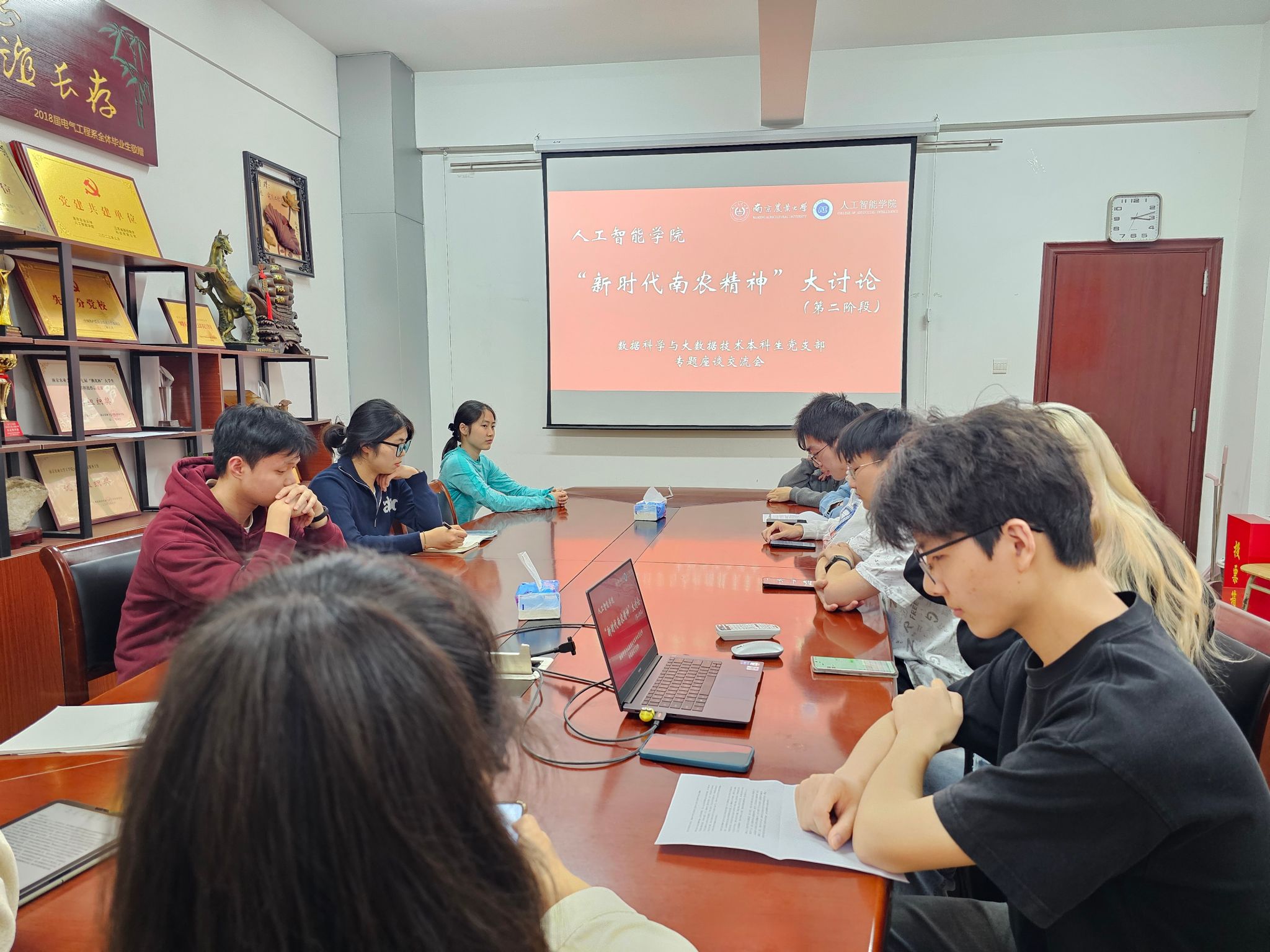 4月18日下午,数据科学与大数据技术本科生党支部于育贤楼B311开展第二阶段研讨活动。支部书记封筱向大家介绍了“新时代南农精神”大讨论第二阶段的目标任务、讨论主题以及研讨内容,并结合工作实际谈到,要传承好“诚朴勤仁”的南农校训,鼓励支部成员利用自身专业践行时代使命,展现出新时代南农人的风采。全体党员进一步加深了对南农精神的理解和认识,更加坚定了信心、明确了方向,将以更加饱满的热情和更加昂扬的斗志将南农精神切实融入日常学习、工作和生活中,在新时代续写“诚朴勤仁”新的篇章。