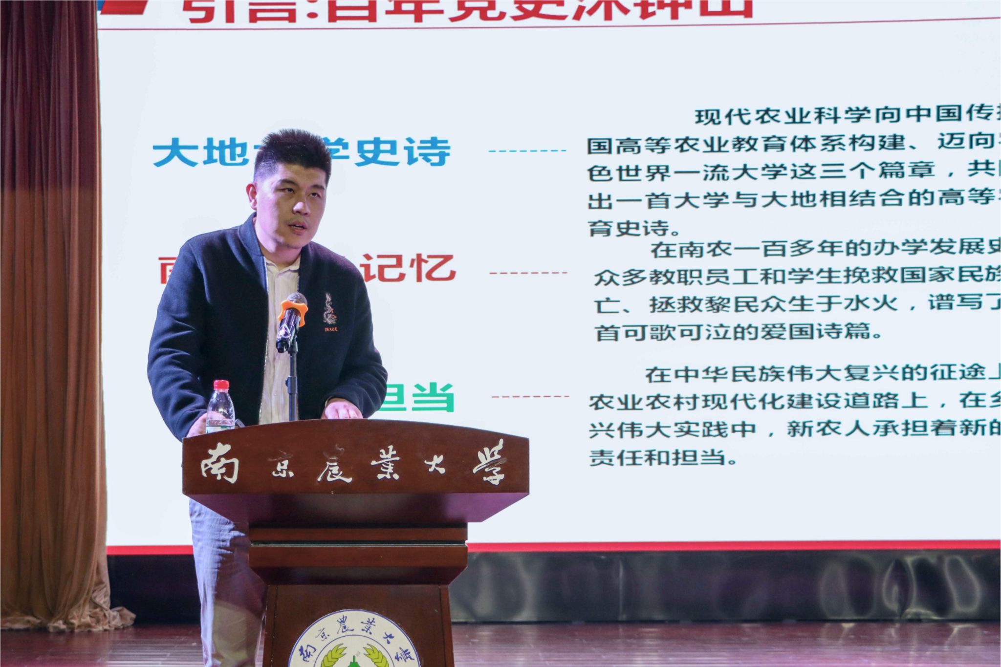 “新时代南农精神大讨论”2024年春季入党积极分子培训班专题党课在大学生活动中心顺利开展。校党委组织部党校办公室主任何旭以“校史红色记忆与青年时代担当”为主题,从党史联系校史的角度,结合新时代南农精神,追忆金善宝先生、邹秉文先生等南农优秀前辈的故事,讲述了新时代南农人的使命与担当,带领学员感受到南农深厚的历史底蕴、丰硕的实践成果和奋发的进取精神,激发青年学子的时代担当。