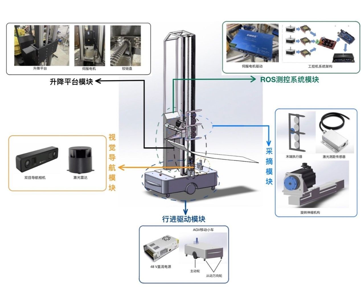 一等奖作品《杏鲍菇收割机器人》具有遍历多层菇床、自主导航对刀、高效无损采摘、协同控制等功能。以水平生长的袋栽杏鲍菇为采摘对象,针对工厂化种植,模块化设计杏鲍菇收割机器人,包括:AGV移动升降平台、四格旋转伸缩收割手爪、视觉导航系统、视觉自适应切割控制系统以及ROS测控系统。