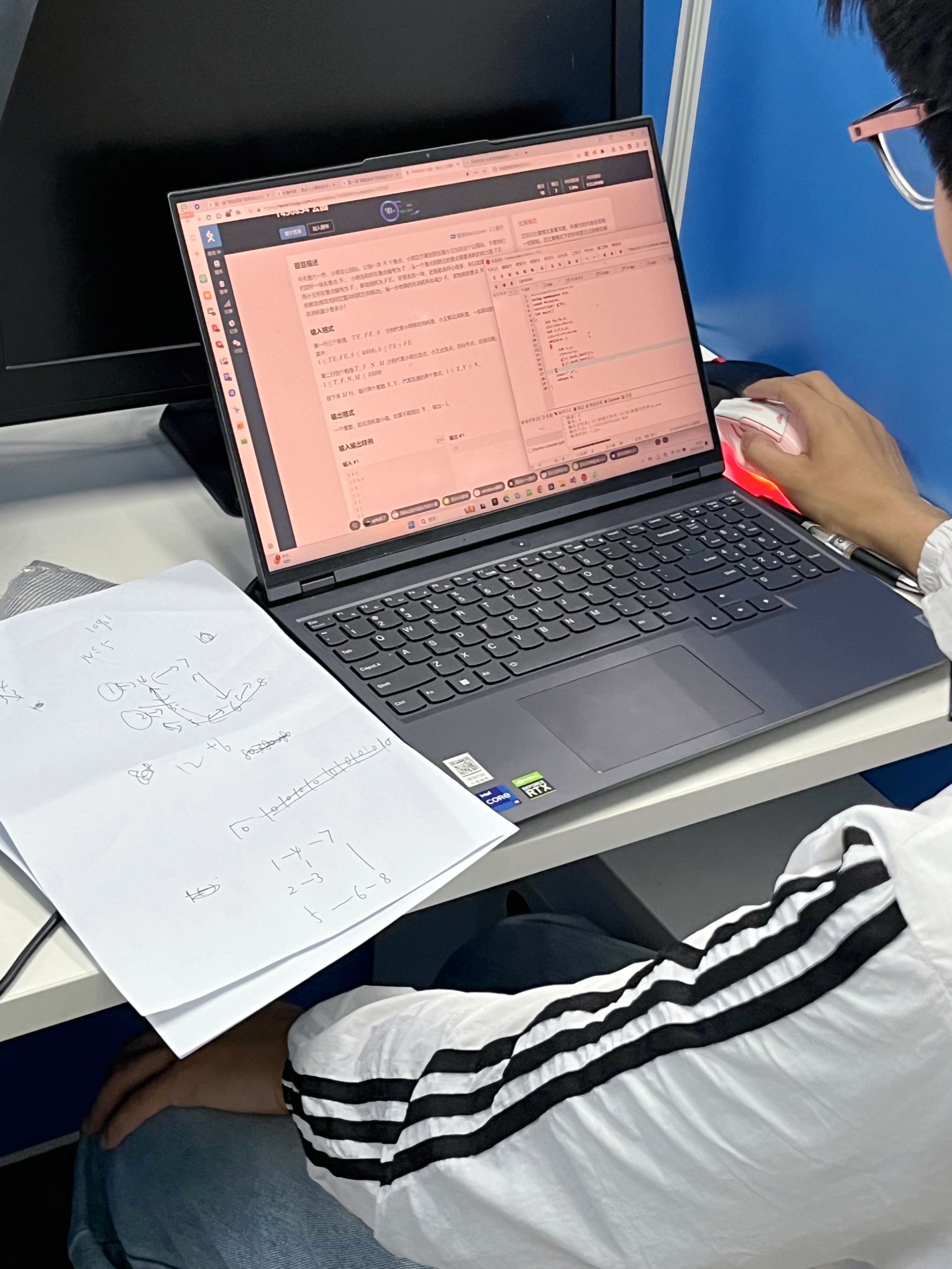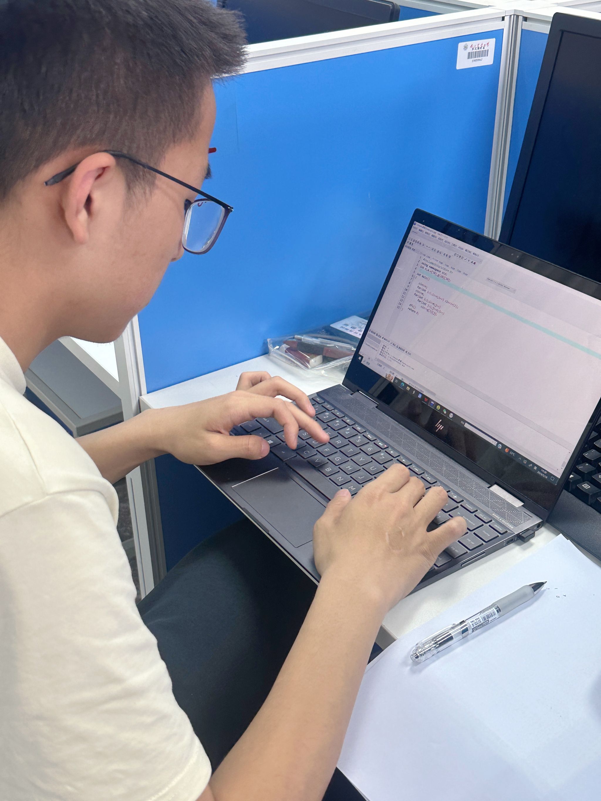 比赛现场,每人一台机位,参赛选手使用电脑编译器编写代码,并将代码提交到答题网站,由比赛系统根据测试样例自动评判分数。