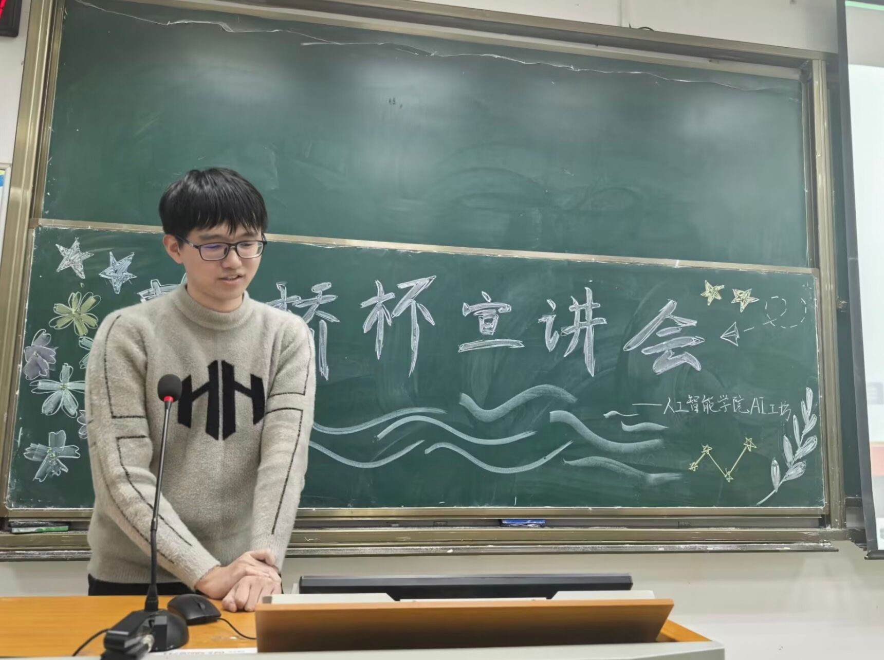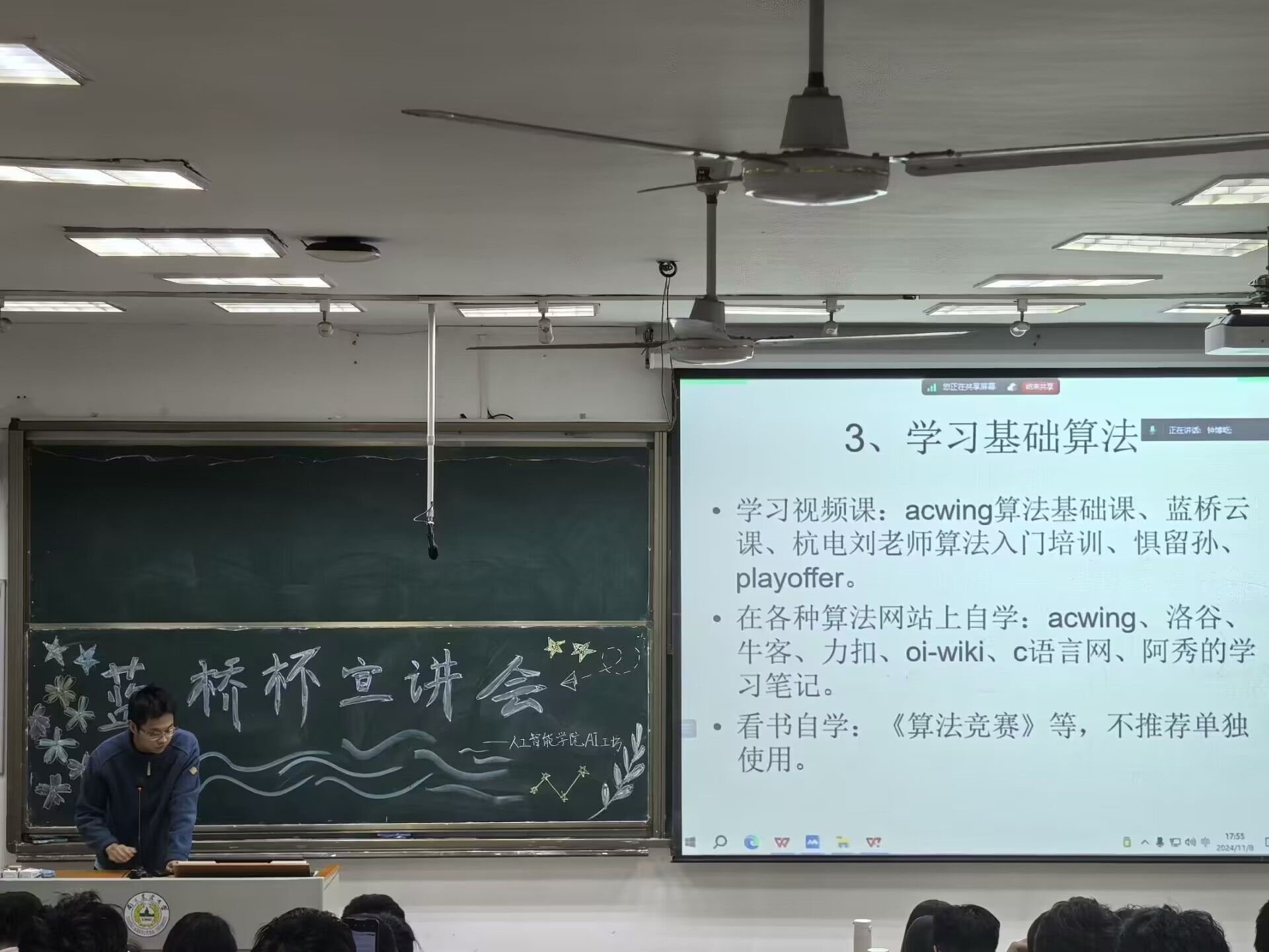 AI工坊于汇贤楼C202举办第十六届“蓝桥杯”全国软件和信息技术专业人才大赛宣讲会。宣讲会邀请计算机系陆静老师线上指导,往届优秀参赛选手代表张博轩、黄子琰和顾慎之线下宣讲,200余名同学参与活动。