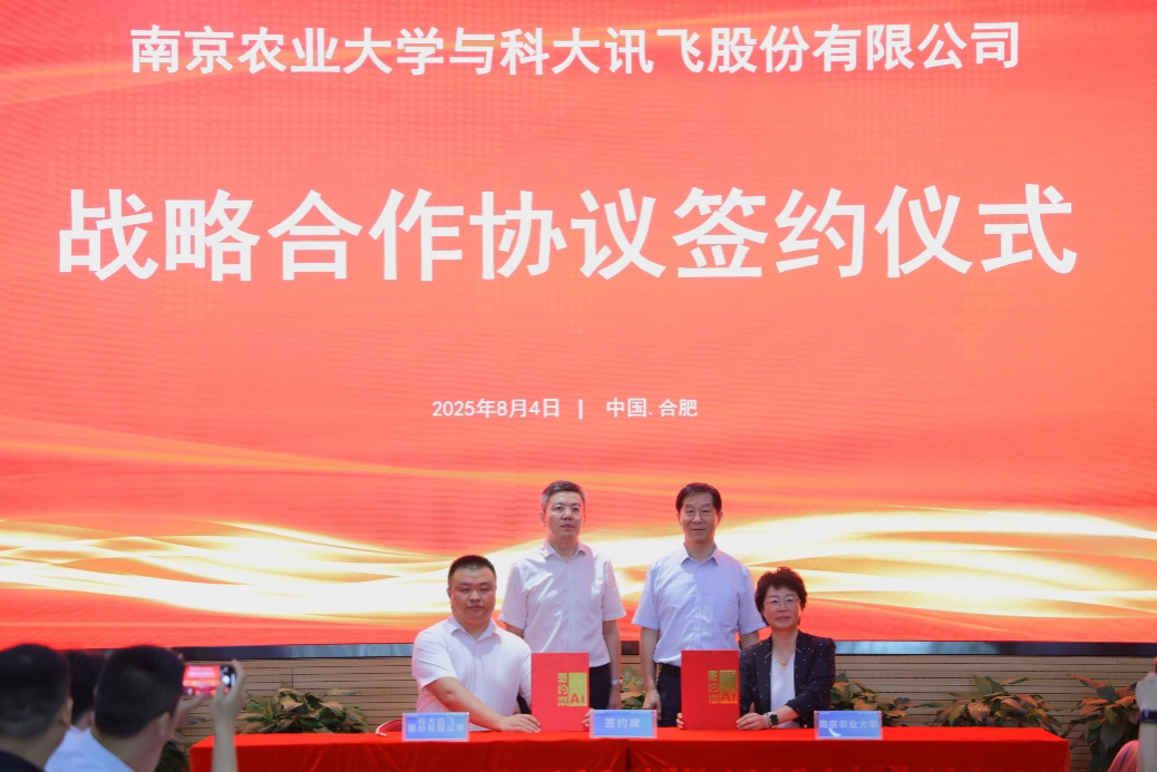 智慧农业研究院名誉院长曹卫星,科大讯飞副总裁、江苏大区总经理黄飞云,科大讯飞高教事业部副总经理尹明磊,学校党委常委、副校长朱艳等出席签约仪式。