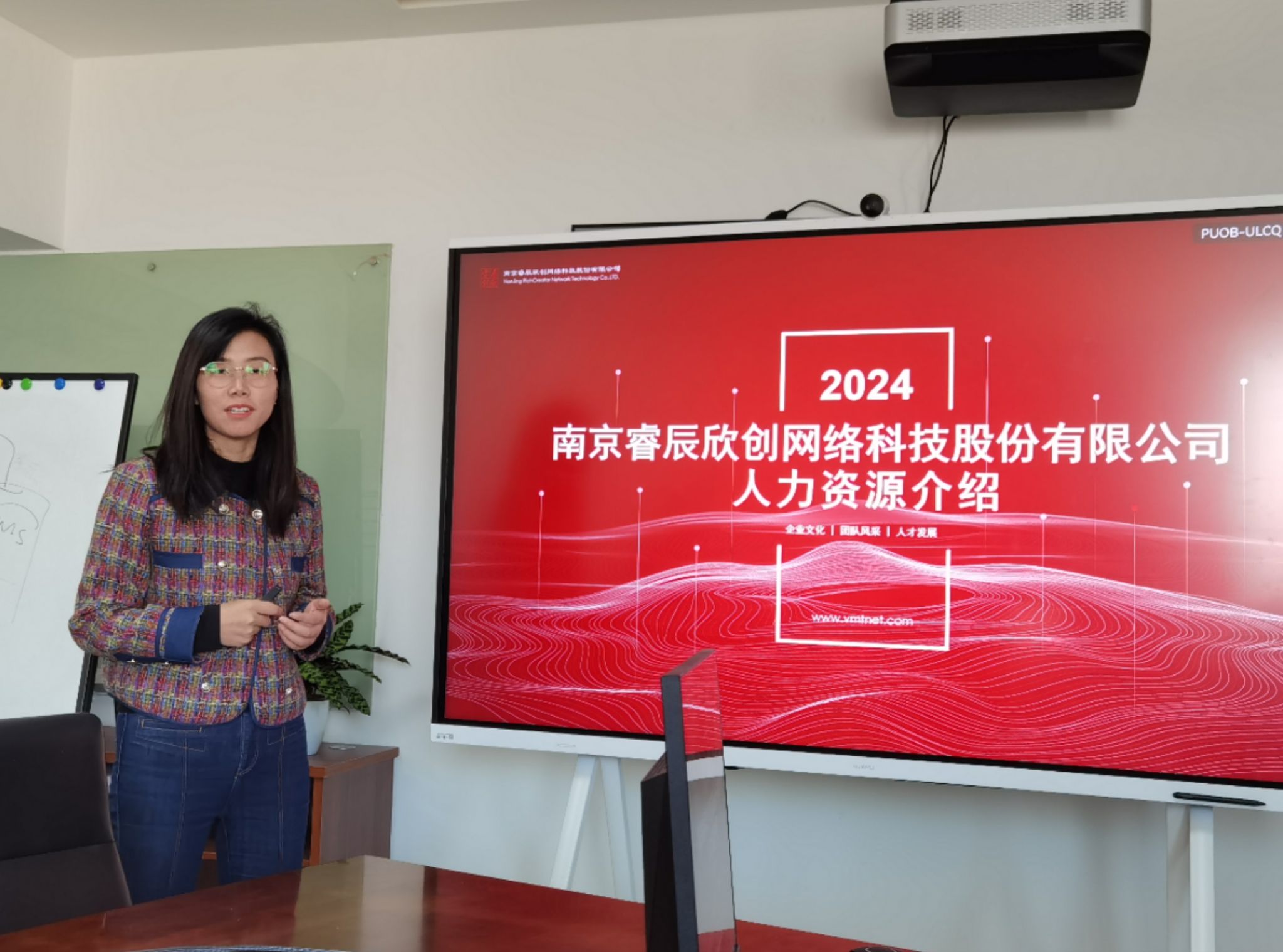 移步会议室,销售部负责人杨阳、人力资源部负责人黄金芳,分别介绍了睿辰欣创的基本情况、发展历程、产品体系、日本无码、人才发展培训体系、薪酬福利体系及2024届应届毕业生的招聘需求等。
