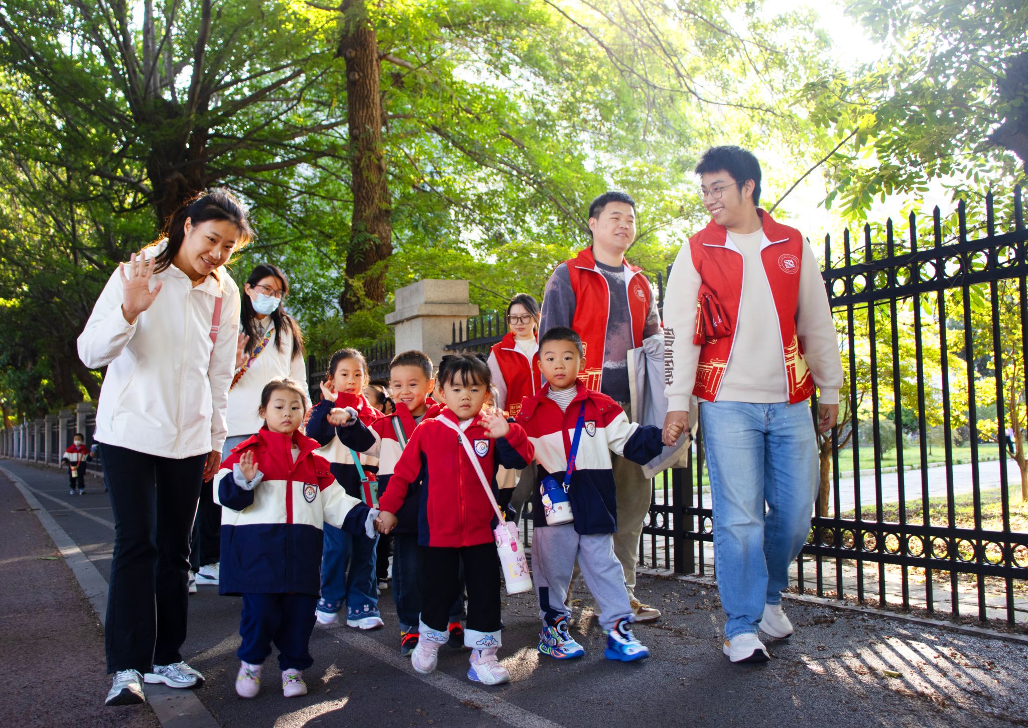 活动当日,浦口校区化身秋日童话世界。志愿者们化身“自然向导”,带领孩子们沿精心设计的实践路线漫步,孩子们时而俯身拾起银杏叶,时而驻足观察梧桐树。稚嫩的提问与清脆的笑声在校园回荡。“老师,枫叶为什么会变红呀?”“梧桐树的树杈为什么这么大?”面对孩子们的好奇心,志愿者们用生动的比喻和互动游戏,将植物生长知识融入自然观察,让科学启蒙在秋游中悄然发生。