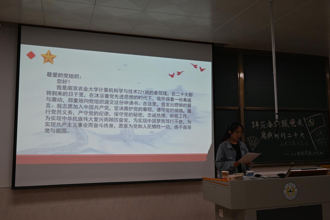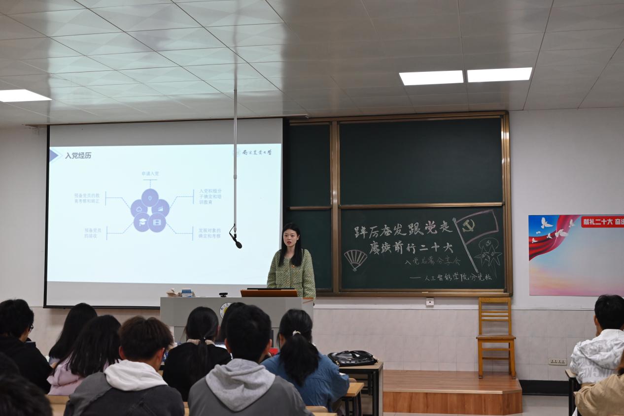 为强化榜样示范,优秀学生党员代表杨凯云同学结合自己入党的心路历程,从夯实专业知识、服务班级同学、全面提升自我等方面作了交流分享,用守初心、践初心的经历为2022级同学申请入党指明了努力方向,引导新生自觉树立正确政治立场和思想导向。