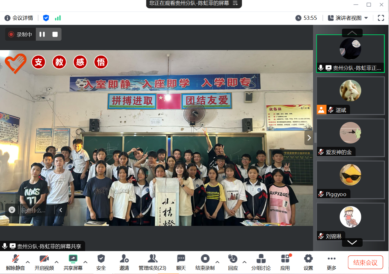 “研支团”的政策进行了全面剖析,并从校园简介、工作内容、衣食住行等多方面切入,详细介绍了她在贵州地区支教工作中的点点滴滴。她表示,每当在课堂上看到学生们求知若渴的双眼和沉浸学习的身影,自己也收获了满满的自豪与感动。教育不仅仅是单方面的教授给别人知识,更是对自己成长的见证和考验。最后,她呼吁同学们都能积极加入研究生支教团,让青春力量建功立业,让志愿精神薪火相传。